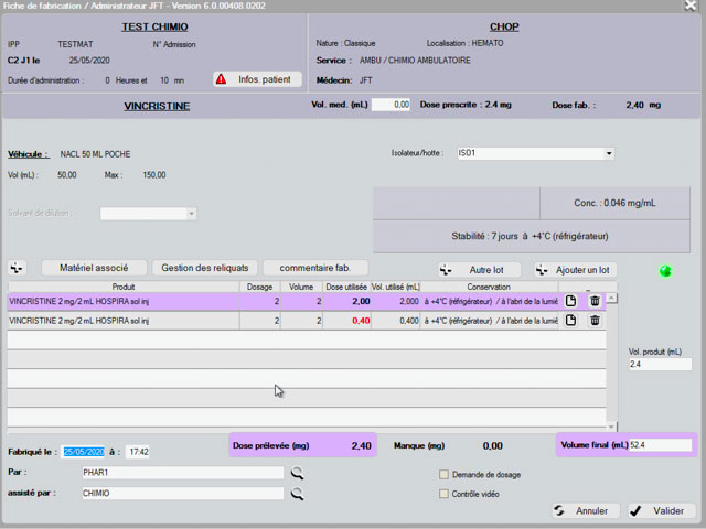 Chimio 6.0 offre un mode de gestion plus fin avec la possibilité de définir la répartition et les dosages des différentes seringues. De plus, un numéro d’ordonnancier est attribué à chaque seringue. Enfin, là aussi, l’opérateur peut choisir de travailler en mode dématérialisé.